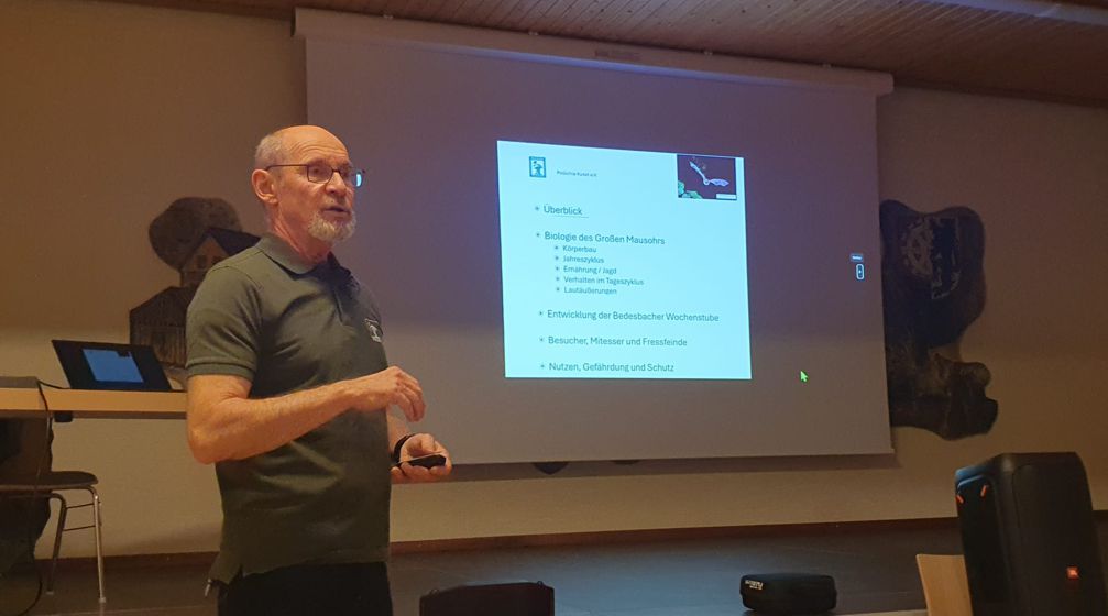 Besonderes Highlight waren die Infrarot-Videoaufnahmen aus der Dachkammer in der mehr als 1500 Große Mausohren ihre Jungen aufziehen. Nach diesem Vortrag sieht man die Fledermäuse evtl. in einem ganz anderen Licht. Nicht als abschreckend, sondern als nützlich für die Artenvielfalt in unserer Region.