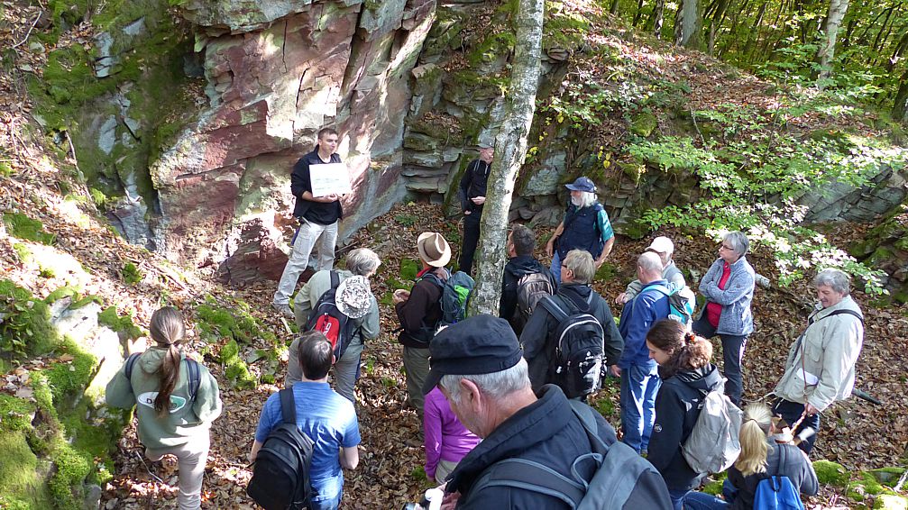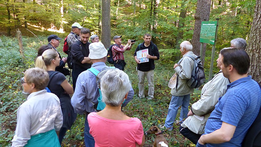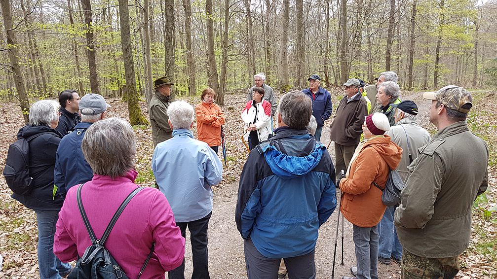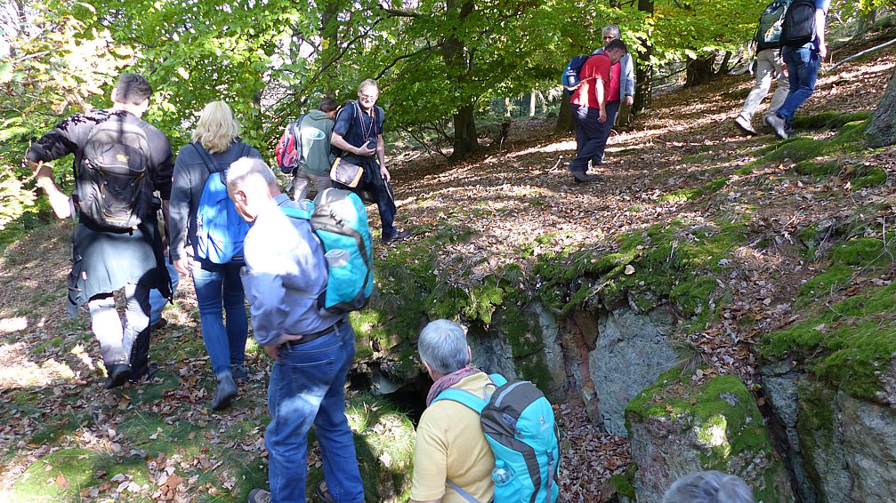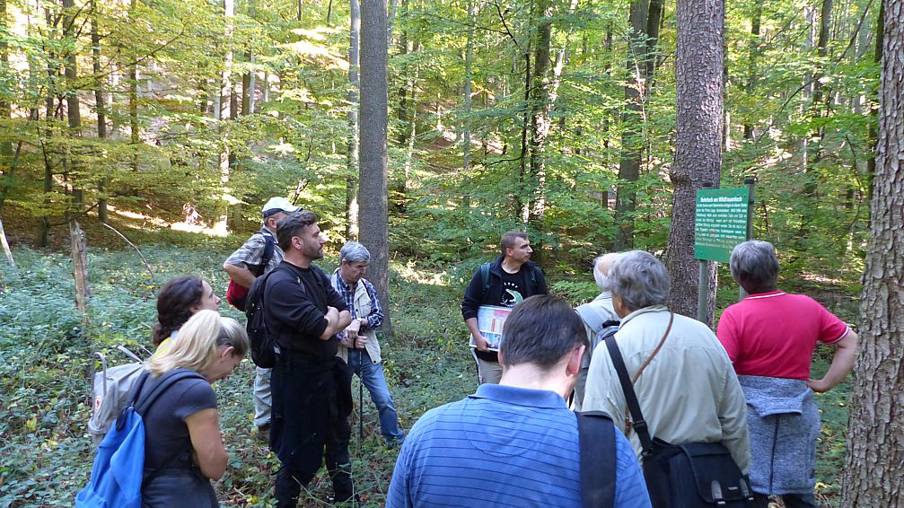 Zu Mittag wurde mit Börfink im Herzen des neuen Nationalparks Hunsrück Hochwald das zweite Ziel der Exkursion erreicht. Nachdem im dortigen Forellenhof Trauntal ein Mittagessen eingenommen worden war, übernahm Dr. Ernst Segatz die weitere Führung. Segatz ist Mitarbeiter der Forschungsanstalt für Waldökologie und Forstwirtschaft in Trippstadt und der Nationalparkverwaltung. Bei einer Wanderung rund um den Ortsteil Thranenweier, der sogenannten Inseltour, ging Segatz der Frage nach, wie Naturschutz in dem erst 2015 gegründeten Nationalpark gestaltet und entwickelt werden kann. Soll man die Natur sich völlig frei entfalten lassen oder muss der Mensch zumindest für eine Übergangsszeit regulierend eingreifen? Der Nationalpark ist mit ca. 11.000 ha nicht sehr groß, gehört zum größten Teil zu Rheinland-Pfalz und mit einem kleinen Teil zum Saarland. Er besitzt eine längliche Form, so dass er an manchen Stellen nur ca. 5 km breit ist, was für die Verfolgung des Naturschutzes nicht unbedingt förderlich ist.. Seine Gründung geschah nicht im luftleeren Raum, sondern war nur in Abstimmung mit den unterschiedlichsten Gruppen und Interessen möglich wie den Kommunen, dem Tourismus, den Jägern, der Forstwirtschaft und den privaten Holznutzern, um nur wenige zu nennen. Es versteht sich aber von selbst, dass der Naturschutz das vordringliche Ziel des Nationalparks ist. Kurz nach seiner Gründung ist es notwendig, früher vorgenommene schädliche Eingriffe des Menschen wie die Entwässerung von Mooren zu beseitigen, um den ursprünglichen naturnahen Zustand wiederherzustellen. In dieser Hinsicht ist der Nationalpark erst noch in der Entwicklung.