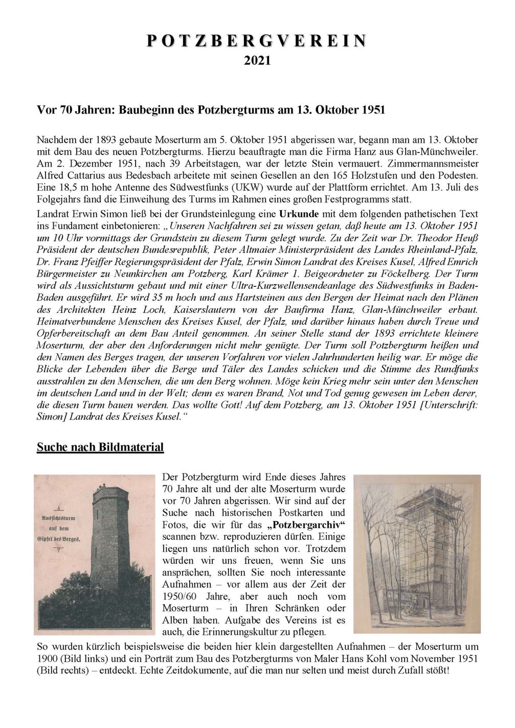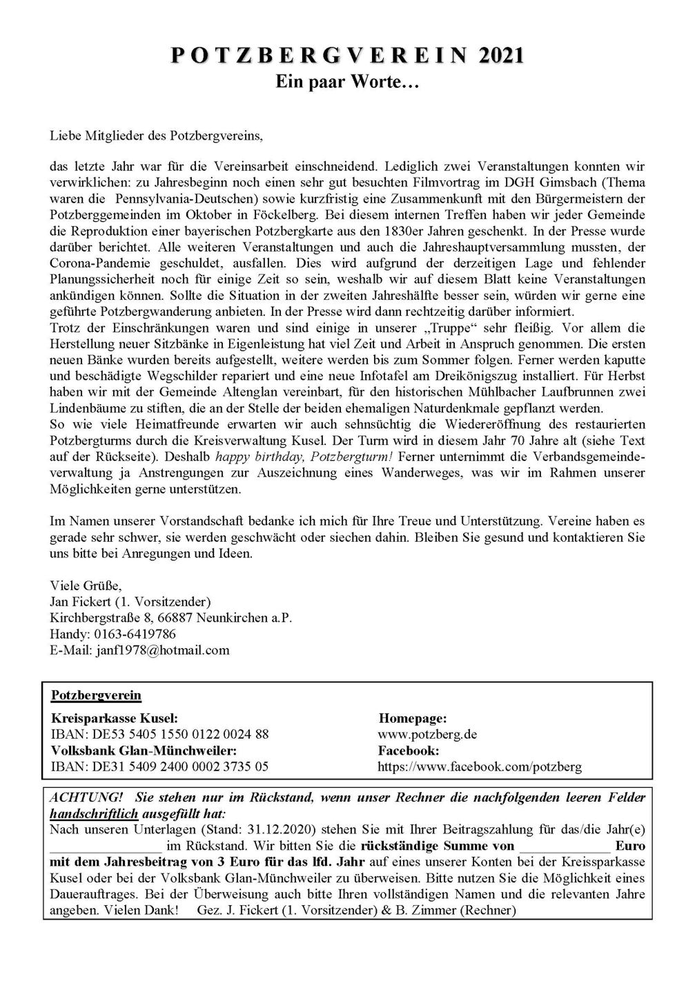 Zur Jahreshauptversammlung hatte der Potzbergverein am 29. Oktober seine Mitglieder ins Dorfgemeinschaftshaus Matzenbach, im OT Gimsbach eingeladen. Der 1. Vorsitzende Jan Fickert ließ die eingeschränkten Aktivitäten der Coronajahre 2020 und 2021 Revue passieren. Die öffentlichen Veranstaltungen waren nach dem gut besuchten Filmvortrag „Hiwwe wie driwwe“ im März 2020 zum Erliegen gekommen, lediglich eine Potzbergbegehung mit der VG Kusel-Altenglan und ein interner Informationsaustausch mit den Bürgermeisterinnen und Bürgermeistern der Potzberggemeinden, bei dem jeder Gemeinde eine gerahmte Potzbergkarte aus den 1830er Jahren überreicht wurde, wurden durchgeführt. Trotzdem seien die Vorstandsmitglieder aktiv im Hintergrund tätig gewesen. Es wurde eine schöne Sitzgruppe neben dem Richtungsbaum auf dem Potzberggipfel konzipiert und errichtet sowie eine Gedenktafel „125 Jahre Schützenbrunnen“ an der Brunnenanlage angebracht. Es wurden sieben neue Sitzbänke für den Potzbergwald gebaut und aufgestellt. Im Jahr 2021 wurden u.a. Reparaturen durchgeführt, ferner vier weitere Sitzbänke und am Dreikönigszug eine Infotafel installiert, die die geschichtliche Bedeutung der Siedlung im Hinblick auf den einstigen Bergbau beleuchtet. Zwei Lindenbäume würden in Kürze noch für den alten Mühlbacher Laufbrunnen gestiftet und gepflanzt. Der Verein habe zurzeit 213 Mitglieder, sei 2020 erfreulicherweise von 198 auf 212 Mitglieder angewachsen und 2021 weitgehend konstant geblieben. Mit einer Gedenkminute wurde 4 Sterbefällen gedacht. Wie aus den Jahresberichten 2020 und 2021 von Kassenwart Bruno Zimmer und Kassenprüfer Heinz Haufschild zu entnehmen war, steht der Verein finanziell auf gesunden Füßen. Beanstandungen gab es keine, die Vorstandschaft wurde entlastet. Bei den anschließenden Neuwahlen gab es bis auf eine Ausnahme keine Veränderungen. Edgar Koch aus Matzenbach wurde als zusätzlicher Beisitzer in den Vorstand aufgenommen. Der Vorstand im Überblick: Jan Fickert würdigte die aktuellen Jubiläen „70 Jahre Potzbergturm“ und „20 Jahre Webseite Potzberg“ (betreut durch Sigmund Niebergall) und wies auf das 50-jährige Vereinsjubiläum im nächsten Jahr hin. Erste Veranstaltungs- und Projektvorschläge wurden im Anschluss diskutiert.