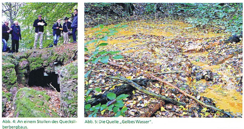 Ein wichtiges Kapitel dieser Exkursion war natürlich dem Bergbau gewidmet. Dieser begann am Potzberg erst relativ spät und fand vorwiegend im 18. und 19. Jahrhundert statt. Gesucht und gefunden wurde vor allem Zinnober (Quecksilbersulfid), der zur Herstellung von Quecksilber diente. Auf der