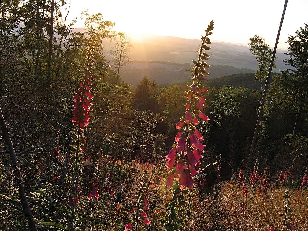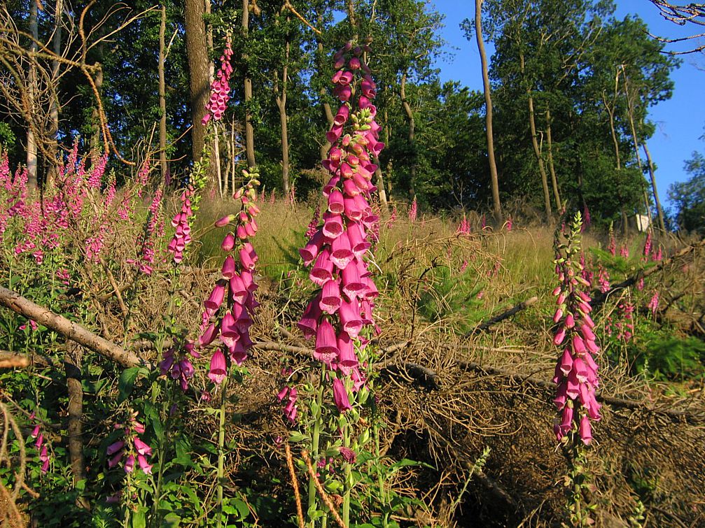 Eine typische Charakterpflanze des Potzberges ist der Rote Fingerhut (Digitalis purpurea), der zu den Braunwurzgewächsen gehört und durch seine 3-5 cm langen purpurroten und fingerhutförmigen Blüten auffällt. Diese sind in ihrem Innern behaart und haben dunkelrote, weiß umrandete Flecken. Die Pflanze, die 30-150 cm hoch wird, blüht von Juni bis August. Die Grundblätter sind rosettenförmig angeordnet. Typische Standorte der Pflanze sind Waldränder und Lichtungen, Kahlschläge und lichte Wälder mit kalkarmen, sandigem und stickstoffhaltigem Lehmboden. Wie der Hasenlattich am Potzberg ist es eine Zeigerpflanze für Böden mit sauerer Tendenz. Der zweijährige Fingerhut steht oft zerstreut in lockeren Beständen. Die Bestäubung der Blüten wird durch Hummeln besorgt.