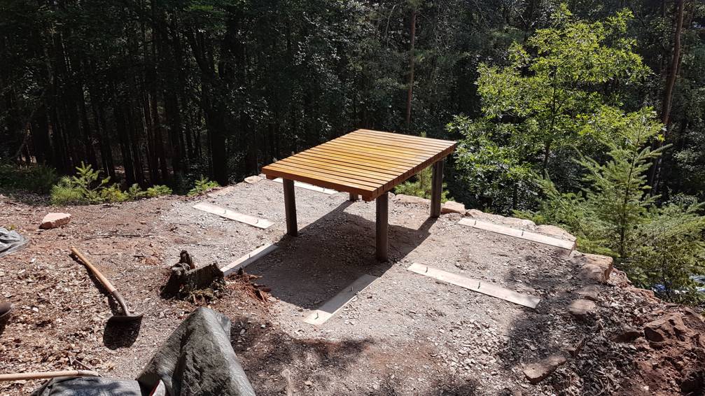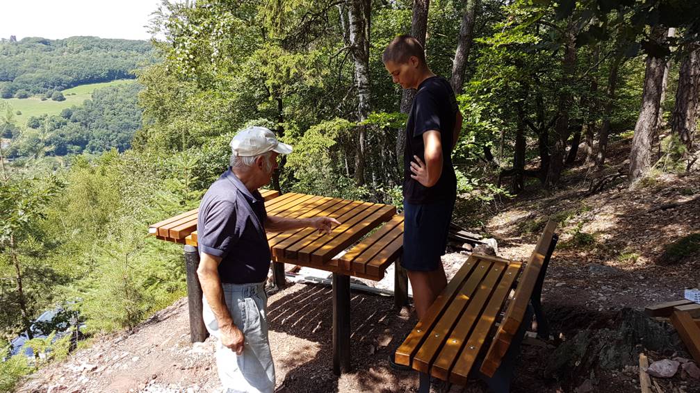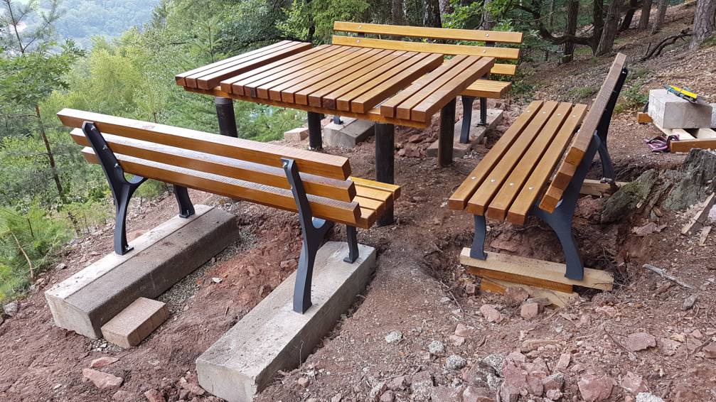 ![]() Juli: Die drei Bänke und der Tisch (alles Maßanfertigungen) sind hier fertig montiert. Das Eichenholz wurde von Friedel Gabel aus Neunkirchen gespendet.![]() Probeweise konnte eine Bank und der Tisch schon mal aufgestellt werden. ![]() ![]() Probesitzen - bequem und passt.
