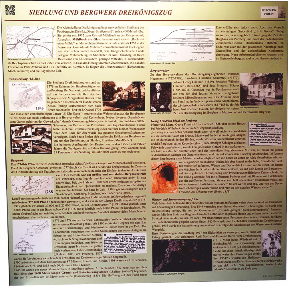 Die Infotafel gibt einen Einblick in das Siedlungsleben und den Bergbau dieses sehr bekannten Bergbaugebietes oberhalb von Mühlbach am Glan. Nähere Informationen finden Sie auch unter dem Menüpunkt "Historie" auf dieser Webseite.