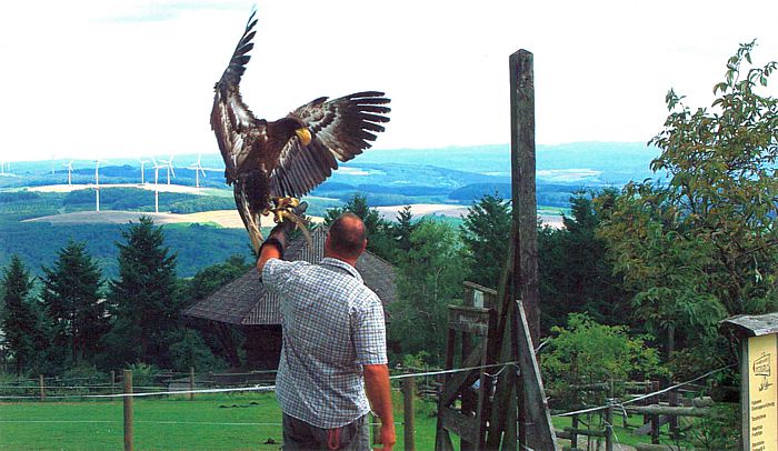 Das neue Blockhaus mit Toiletten, einem längst fälligen Kiosk und einer schönen Terrasse beim nahen Streichelzoo bietet Familien die Möglichkeit etwas länger zu verweilen und sich nach oder vor dem Rundgang zu stärken, um am Nachmittag die imposante Flugschau, die Herr Schauß mit seinen Mitarbeiterinnen und Mitarbeitern vorführt, zu einem unvergesslichen Erlebnis werden zu lassen.