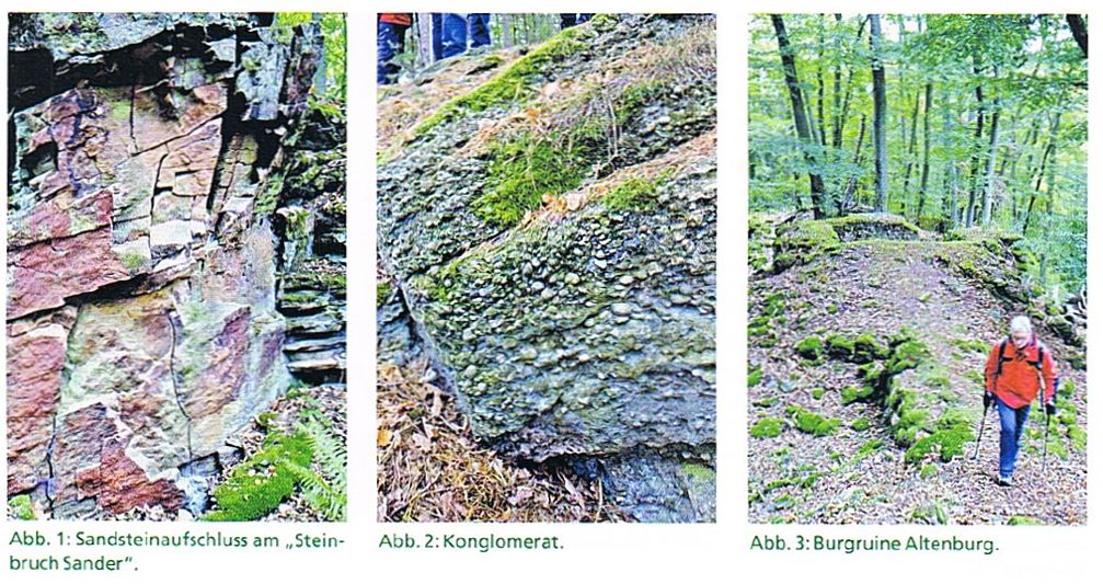 Die Konglomeratschichten sind im Vergleich zum Sandstein deutlich widerstandsfähiger und bilden deshalb oft Vorsprünge, Grate, Sporne und Blockmeere. Dieses stabile Gestein war auch als Fundament einer Burg bestens geeignet. Die Mauerreste der Altenburg (Deinsberg) konnten wir besichtigen.